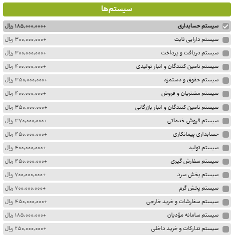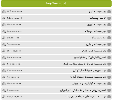 - هر ماژول یا زیرسیستم به صورت جداگانه قابل خرید و فعالسازی بر روی نرمافزار است.